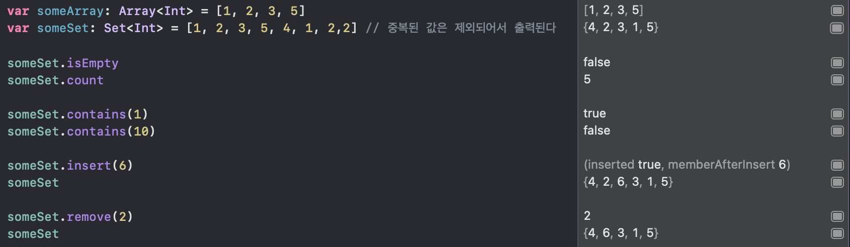 Set : 유일한 값을 가지는 아이템들의 덩어리. 중복이 없는 유닉크한 아이템을 관리할 때 사용한다.