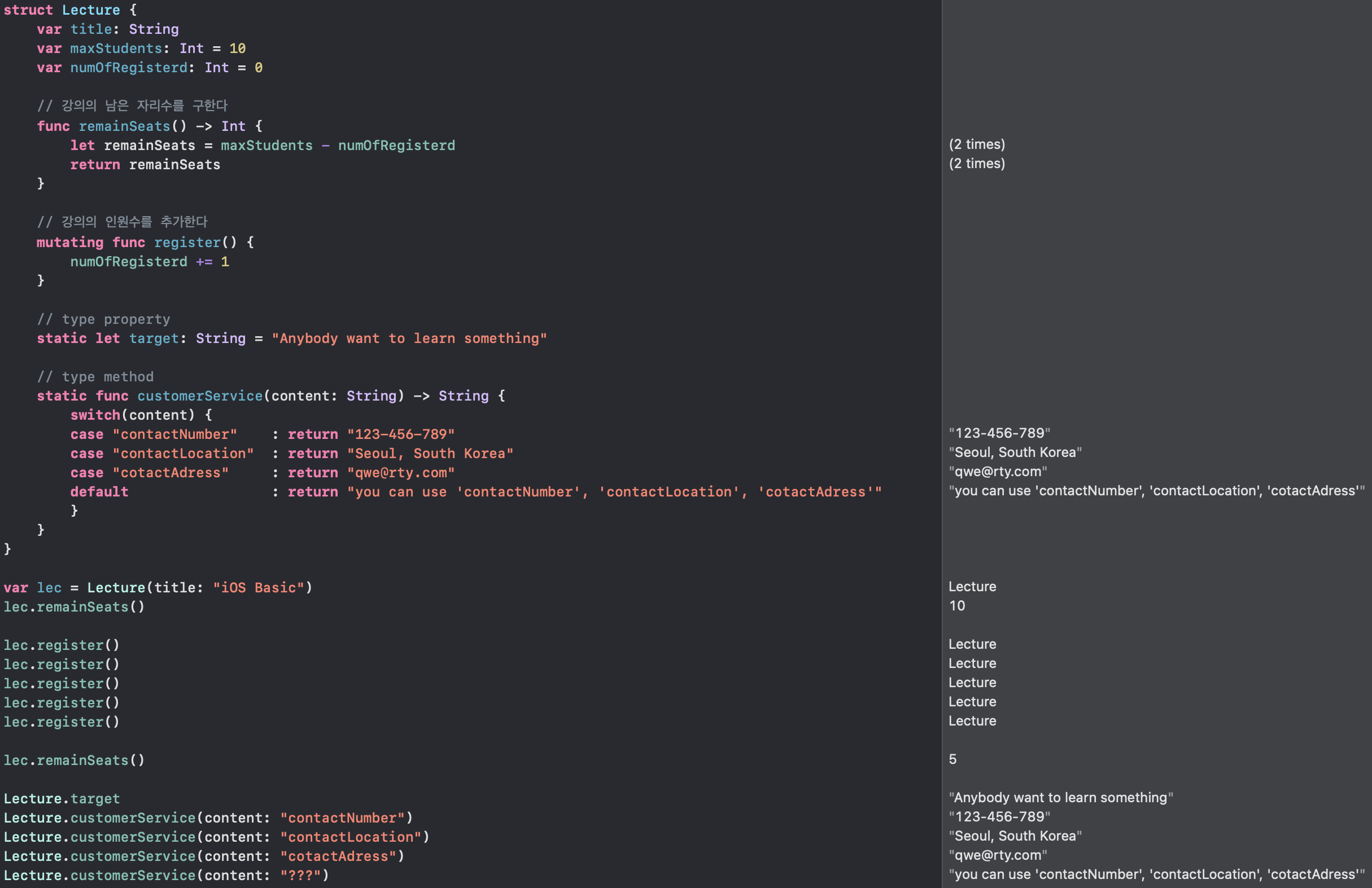 메서드가 stored property값을 변경시키는 경우, func 키워드 앞에 mutating키워드를 넣어줘야한다.