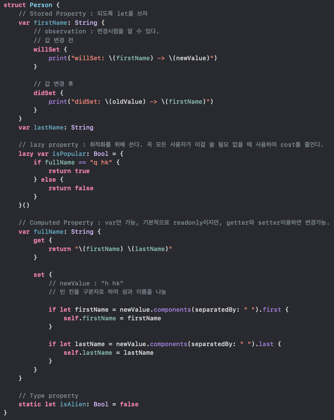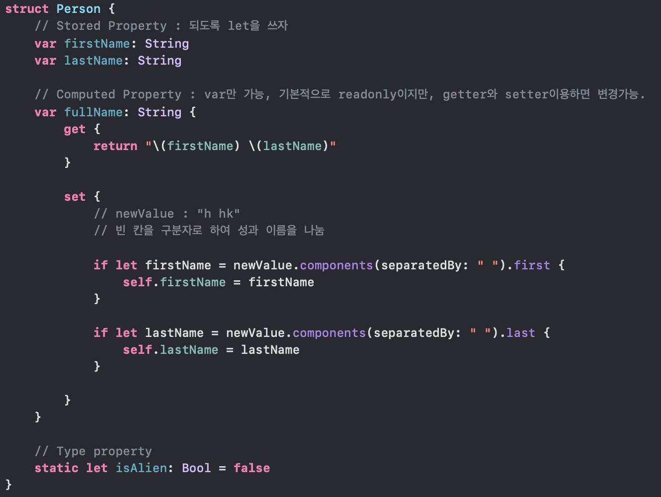 Type Property : 생성된 인스턴스와 상관없이 struct 혹은 class의 타입 자체의 속성을 정하고 싶을 때 사용한다.