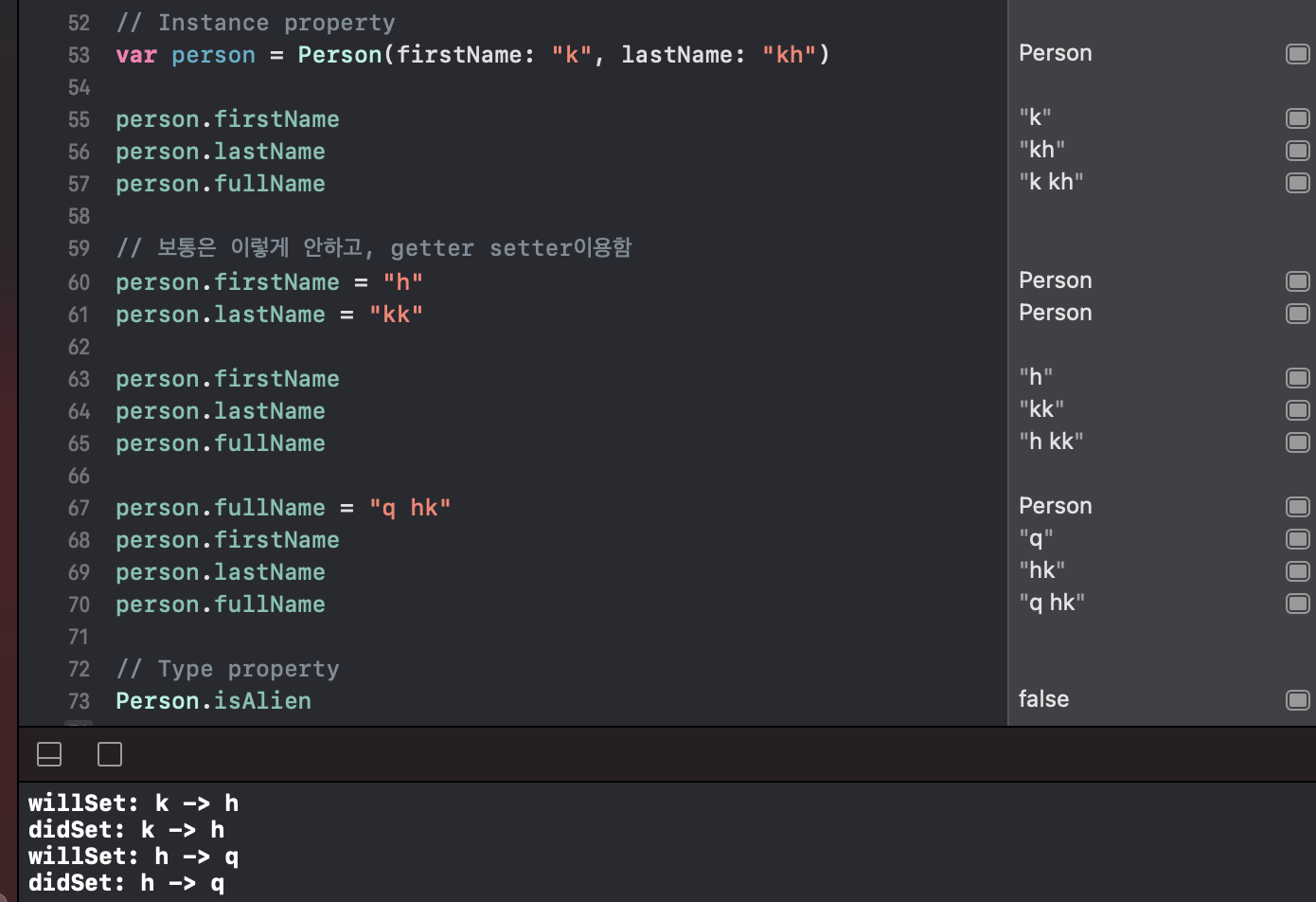 observation : 변경시점을 알 수 있다. willSet은 변경 전, didSet은 변경 후의 시점이다.