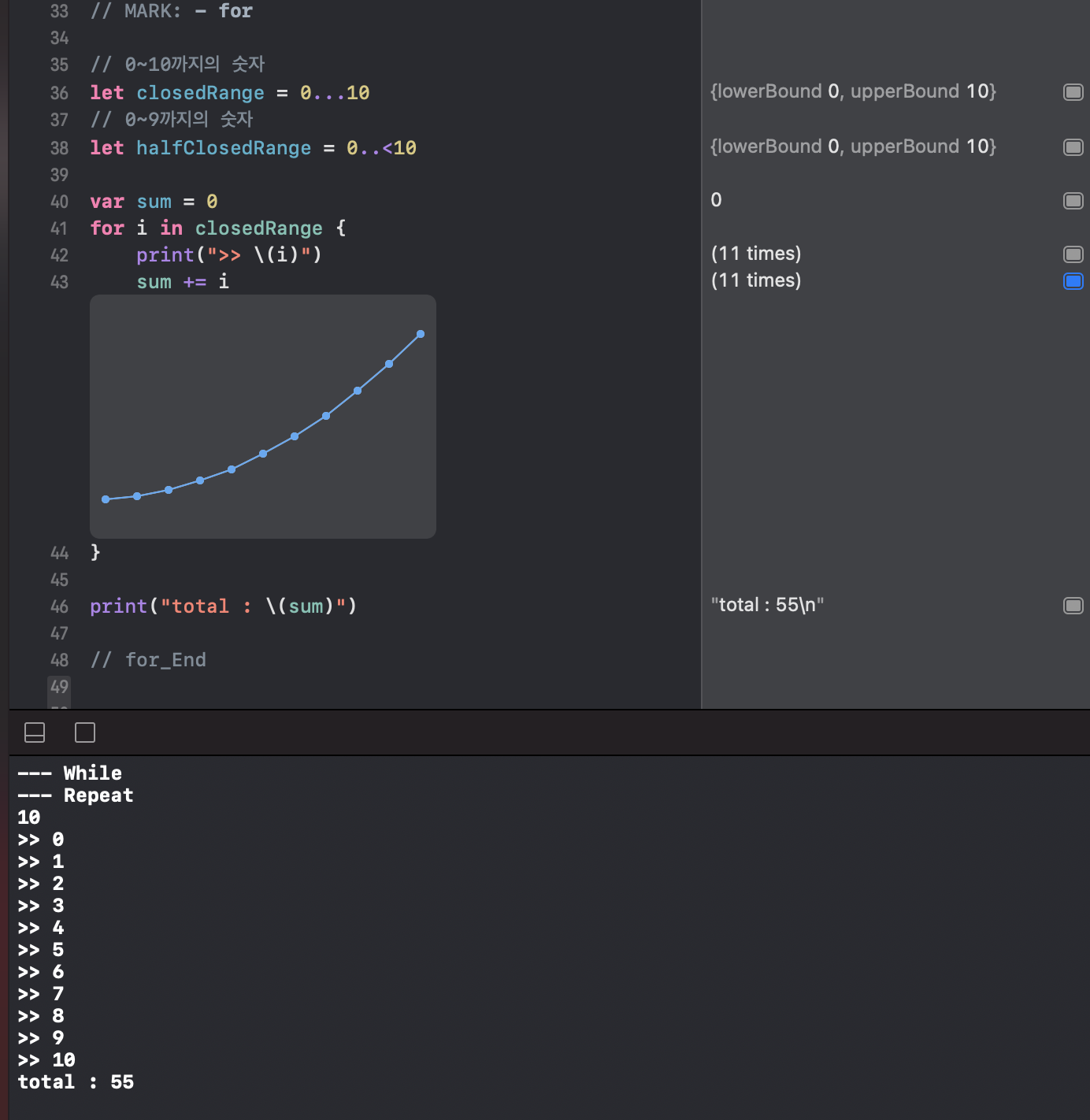 closed range라는 숫자범위 표현법이 있다는 점이 다르다.